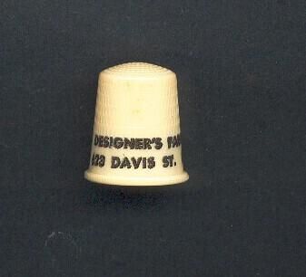 Cream coloured plastic Advertising thimble. Black band with advertising ÒDesignerÕs Fabrics Buy Mail 623 Davis St. Evanston, Ill.*Ó Inside apex B&B St. Paul U.S.A.