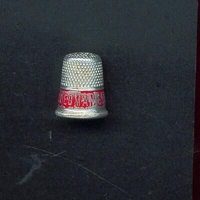 Aluminum Advertising thimble with rolled diagonally lined rim. Red band advertising ÒFriedman Shelby Shoes**Ó No marks.