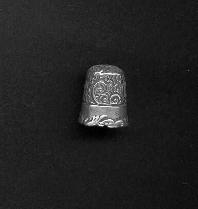 Silver thimble with scalloped rim. Plain band above rim. Size Ò8Ó stamped on band and initials - worn and not readable. Pattern of waves and scallops, called Louis XV pattern, from band to and over top.