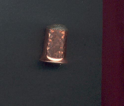 Copper thimble fluted at base with ÒthrupennyÓ piece on top. Body of thimble is hand hammered. A 3 pence English coin in top is dome shaped.
