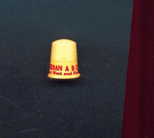 Cream coloured plastic Advertising thimble. Early plastic. Red printing advertising ÒDurban ABC.(P.T.Y.) Ltd. Cor. West and Field Sts.DurbanÓ Inside apex B&B St. Paul.