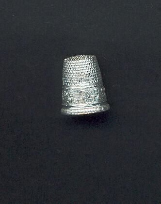 Aluminum Advertising thimble with diagonaly lined rolled rim. Advertising ÒNa-Dru-Co Medicines and Toilet ArticlesÓ Knurling from advertising band to and over top. Germany stamped in knurling.
