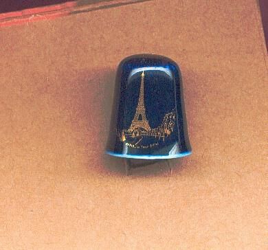 Commemorative thimble.Blue, royal, porcelain thimble, slightly fluted with Eiffel Tower in gold on body of thimble. Below picture in gold is printed ÒParis - la tour EiffelÓ. Inside in gold Limoges France.