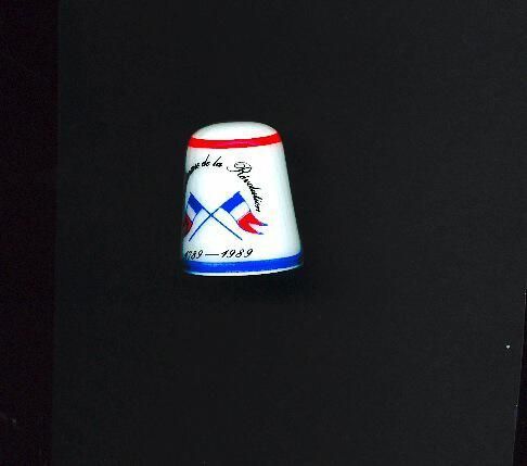 White porcelain thimble, COMMEMORATIVE Red band around top of thimbler, blue band at rim. Crossed French flags in center with ÒBicentenaire de la RevolutionÓ above and 1789-1989 below. Inside stamped Limoges France Castel White background appears ribbed but is flat.