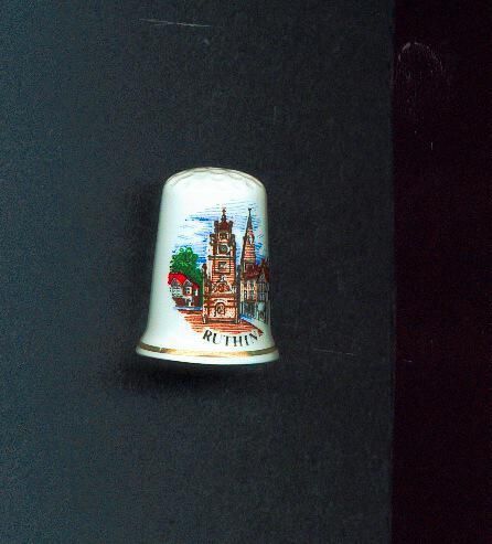 White glazed bone china Souvenir thimble, slightly fluted at rim. Fine gold band around rim. Decal of the town of Ruthin on thimble. Top knurled. Inside logo of Birch tree and printed Birxchcroft Fine Bone China.