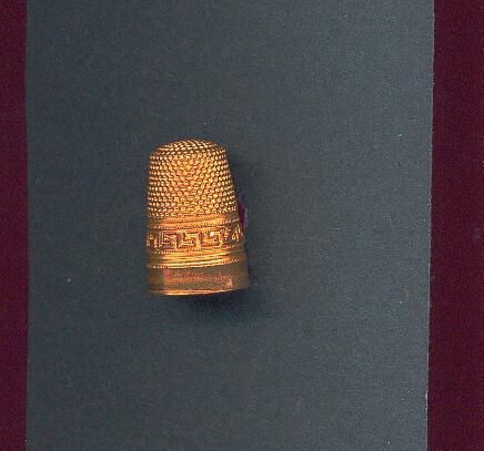 Tall brass thimble with wide plain band at base. Narrow plain band above, then a narrow band of Greek key -left- pattern and finally a narrow plain band before knurling to and over top. Each band is divided by a line of dots. The Greek Key pattern has lines within the lines. No marks