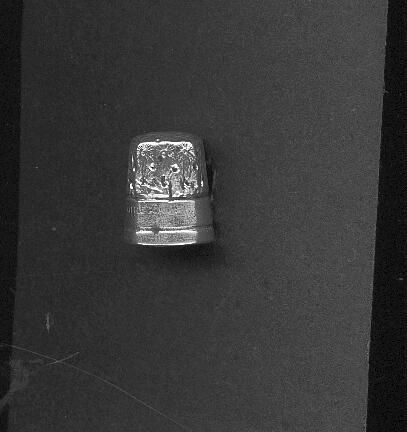Silver thimble with layer of steel between inner and outer layers of silver. Chrysanthenum pattern over top and half way down body of thomble. Narrow plain band at rim, wider plain band above with makerÕs marks. CH (Charles Horner) - 9 (size) Also ÒLittle DorcasÓ
