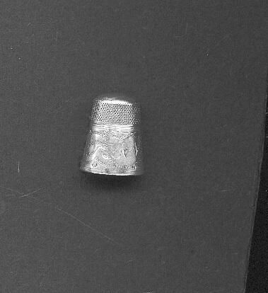 Silver thimble with smooth top. Wide band of pattern 2/3 way up from rim. Wavy lines of dots, double lines outlining leaves. Shield shaped cartouche with initials AN.
