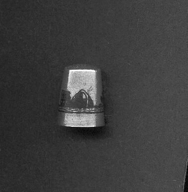 Silver thimble from the Middle East. Plain body with Niello scene - water, ships, building, rock. Hand knurling on top.