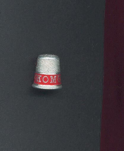 Aluminum Advertising thimble with red band. Advertising ÒKomo FlourÓ Rolled vertically lined. No marks.