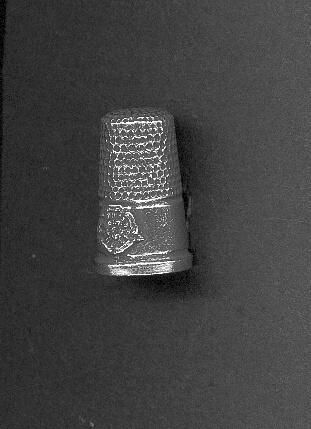 REPLICA thimble. Pewter, tall, cast with narrow raised rim. Wide band with Tudor Rose one side and Tudor coat-of-arms other side. Knurling to and over flat top.