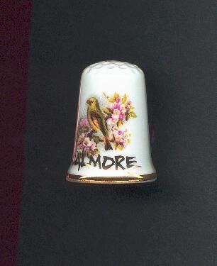 White china fluted Souvenir thimble. Bird on branch of flowers with ÒCalmoreÓ in gold, Gold band at rim. Inside 3 roses in black with Fine Bone China Made in England.Colours manly pink, green gray and yellow.