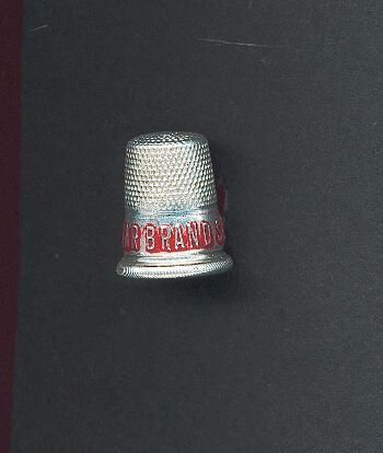 Aluminum Advertising thimble with rolled vertical lined rim. Red band advertising Ò*Star Brand Shoes are betterÓ No marks.