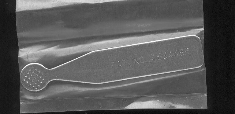 Metal - steel - quilting thimble. Pat. No. 4534495 stamped on handle. Instructions for use on package. 5Ó long metal handle, tapering to small round end with waffle indentations.