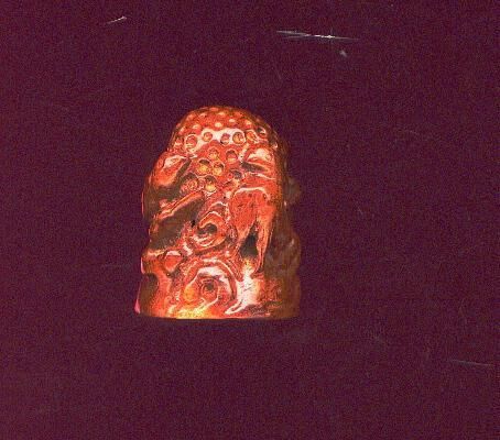 Large ornate carved wooden thimble from China. 2 birds in branches around thimble. Knurling over rounded top. Reddish bron wood. No marks.