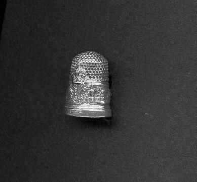 Silver Commemorative thimble. Commmemorated the Coronation of King George V & Queen Mary of Great Britain.Applied gold crown over initals GM1911 surrounded by shamrock, and thistle. Around band is Buckingham Palace,4 horses & riders with coach, angel with trumpet overhead & Westminster Abbey.Stamped lower band C&S Co.Ltd 9