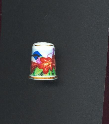 White porcelain thimble with screen printed picture of 2 humming birds with flowers, colour. Slightly fluted, gold band at rim. Inside ÒHaviland, Limoges, FranceÓ.