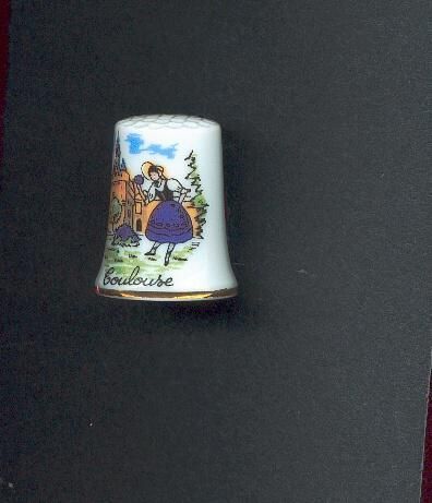 White glazed porcelain Souvenir thimble with narrow gold band at rim.Decalk, coloured, of woman with cathedral in background .ÓToulouseÓ in bland written below. No marks.