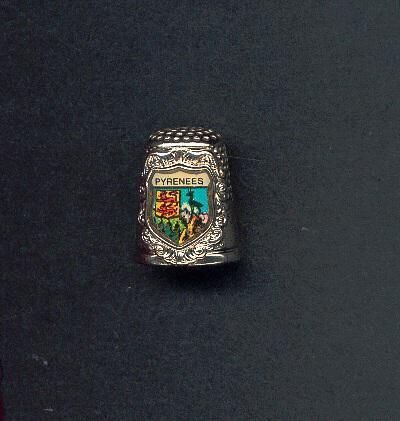 Souvenir metal thim,ble, probably nickel, with metal shield. Coat of arms of ÒPyreneesÓ in colour. No marks. Very heavy thimble.