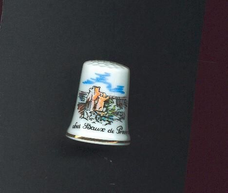 Souvenir white porcelain slightly fluted thimble. Narrow gold band at tim. Coloured decal of old buildings on cliff with the words in black ÒLes Baux de ProvenceÓ below. Flat knurled top.. No marks.