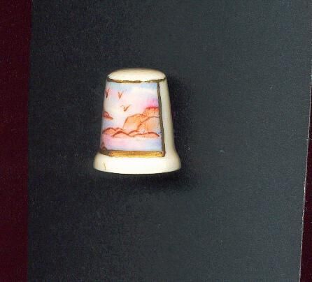Hand painted ceramic thimble. White, glazed outside, unglazed inside, slightly fluted, flat top. Fine gold line around top and to frame scene. Scene - water, islands, gulls, rocks, in colours of blue, pjnk, brown. On back in blue ÒVictoria, B.C.Ó Signed inside - Hand painted with initial H ...,