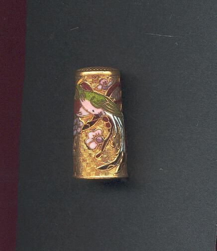 Very tall modern cloisonne thimble. Blue enamel inside. Gold background outside with floweri ing branch and bird in colour.