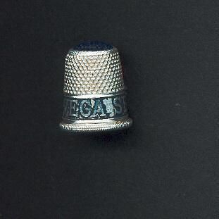 Aluminum Advertising thimble with green -blue band. Rolled vertically lined rim. Advertising ÒVega SeparatorÓ Blue simulated stone in top.