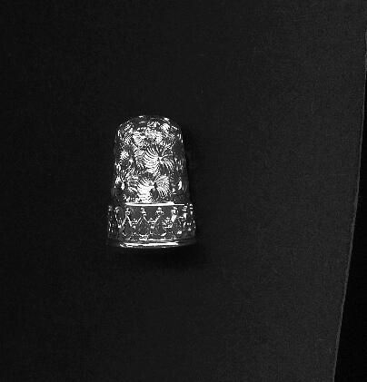 Tall silver thimble witg wide patterned band at rim. All-over daisy pattern from rim to and over top. Stamped just above rim JF (James Fenton - maker) Birmingham year not clear, lion passant.