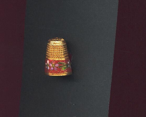 Brass and cloisonne thimble. Wide band of cloisonne above rim. Flowers, leaves on a red background with a narrow band of brass above and at rim. Waffle knurling on the brass to and over top. Green enamel inside.