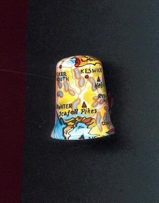 White glazed china Souvenir thimble, slightly fluted at rim./ Decal decoration with map of the Lake District. Many oplaces and lakes marked - colour mainly yelloow, green. Inside marked ÒFine Bone China Norstock Made in EnglandÓ