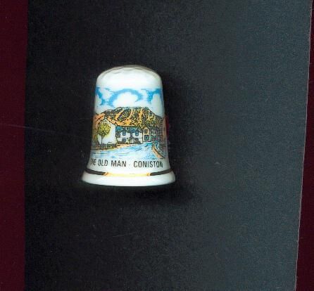 White glazed china Souvenir thimble, slightly fluted with a fine gold line at rim. Decal decorated with houses and hills, Printed ÒThe Old Man ConistonÓ below. On back printed ÒThe English LakesÓ.Inside printed North Lodge Bone China Made in England.