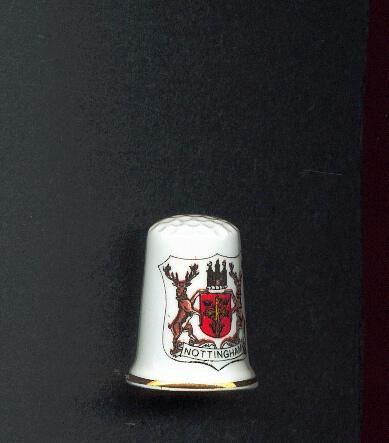 White glazed china Souvenir thimble, slightly fluted. Coat of Arms of Nottingham enclosed in a shield on body of thimble Banner on coat of arms read Nottingham, Colours mainly red, , brown and black Fine gold line at rim. Inside logo - tree and Birchcraft Fine Bone China.