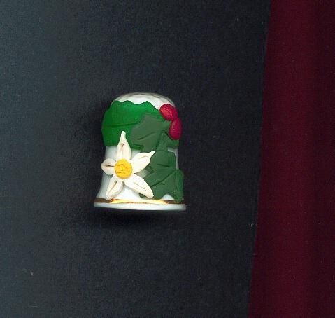 White glazed bone china Christmas thimble. Slightly fluted with gold band at rim. Green holly leaf, red berries, white flower and green leaf added to basic thimble. Top knurled. No marks.