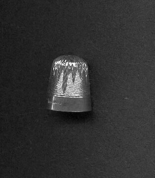 Silver thimble, modern. Wide plain band at rim. Instead of knurling there are slashes, cuts, from center top down sides in an irregular fashion, making it a design against a matte background. Marks on rim for maker W. Manton WHM, Birmingham, lion passant and M for 1986.