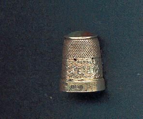 Silver thimble with stone top. Wide band of chrysanthenum pattern above plain rim. Stone probably carnelian., not backed. English hallmarks on plain band - H.G.&S (Henry Griffiths & Son) Size 15, Birmingham, 1919.
