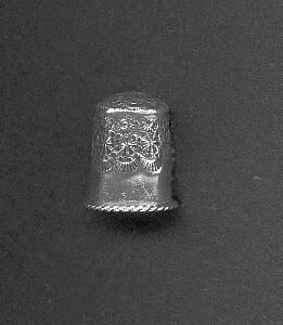Small, silver thimble with rope rim. Wide plain band -1/2 way. Scalloped daisy pattern from halfway to and over rounded top. Stamped inside ÒHandmade SterlingÓ plus 2 other marks.