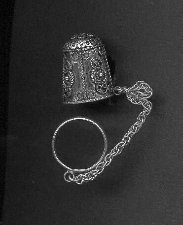 COPY of old Turkish thimble with ring Both ring and thimble sterling silver. Silver blackened with rope rim.Side seamed, separate top.Raised rope design in panels around thimble. Rope circles on rounded top. No marks.