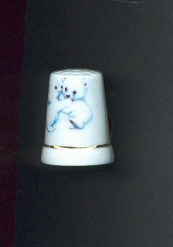 White glazed china thimble with fine gold line at rim. 2 Panda bears outlined in blue on body of thimble. Label Made in Tawain.