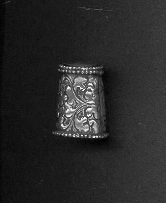 Silver thimble, side seamed, top added. Beading around rim and 2 rows at top. Smooth top. Floral pattern around body of thimble, stamped, blackened and then polished.Stamped on top 925.
