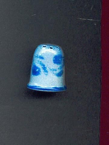 Blue and grey slightly fluted pottery thimble. Simple design of dark blue on pale blue background. 9 holes punched around top. No marks.