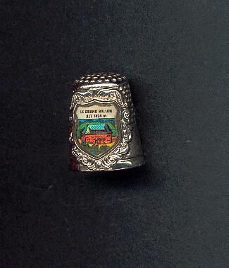 Metal, silver coloured Souvenir thimble. Does not attract magnet. Coloured crest on side with picture of the high [point in Voges Mtns. Caption at top of crest ÒRe Grand Ballon Alt. 1424 mÓ No marks.