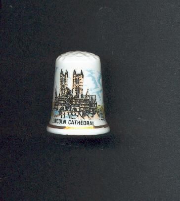 Souvenir bone china thimble. White glazed, slightly fluted with gold band near rim. One side decal of Lincoln CathedralÓ Other side decal of ÒThe Lincoln ImpÓ Inside stamped North Lodge Bone China Made in England.