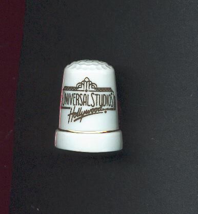White glazed china Souvenir thimble. Chunky with wide rim at base. Gold line at rim. Gold logo of ÒUniversal Studio HollywoodÓ on body of thimble. No marks.