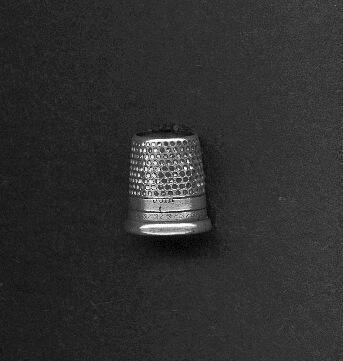 Silver tailorÕs thimble with raised rim. Narrow palmate band of pattern above rim. Narrow plain band above with name or intials plus COIN and 6 (size).