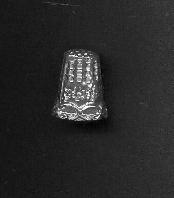 Alpaca metal thimble from Mexico. Wire work design above rim. Plain band above, row of daisy-like flowers then knurling ,waffle type, to and over top. No marks.
