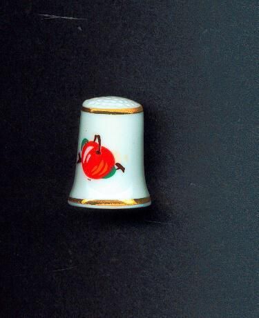 White glazed hand painted porcelain thimble. Unglazed top. Slightly fluted. Gold band at rim and top. Hand painted tomato or apple both sides. Inside logo and Hollohaza Hungary 1834 and 2 in green print.