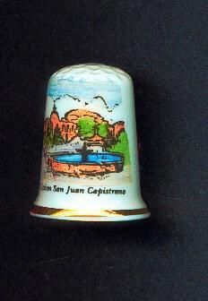 White glazed china Souvenir thimble. Slightly fluted, gold band at rim,knurlng on top. Coloured decal of ÒMission of San Juan CapistranoÓ Inside a crown and Fine Bone China.