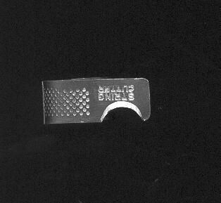 Metal ring type thimble with extended cutter. Stamped below cutter ÒString CutterÓ Also on thimble SKC and Pat.No. 522979