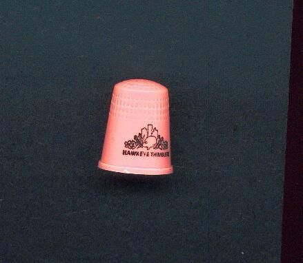 Plastic, pink colour, Personal Advertising thimble with black printing and design. Design of buildings, corn, pig, flowers above the words ÒHawkeye ThimblersÓ Inside top U.S.A. 12.