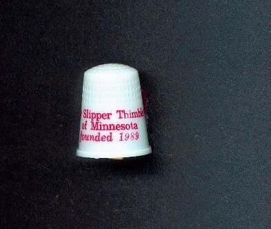 White Personal thimble with red printing ÒLady Slippers of Minnesota founded 1989Ó U.S.A. 3 inside top.